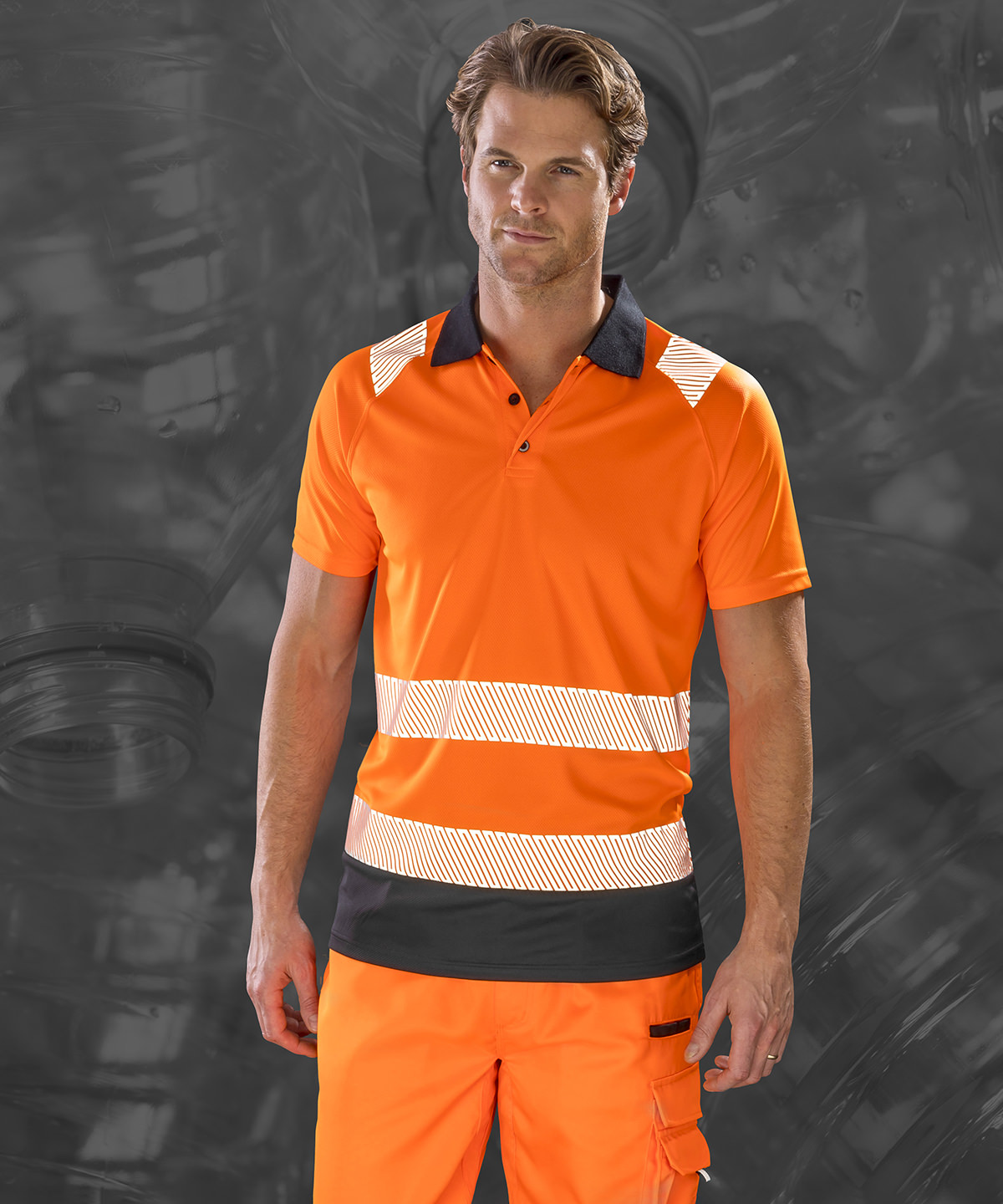 Top stitched shoulder and sleeve detail. Easy-stretch, printed safety bands. Contrast black panel and collar. 3-button placket with spare button. Stretch ribbed collar. End of life recyclable: ideal for Corporate Sustainable Responsibility. Innovative dark panel design to mask grime. Made from highest quality sustainable yarns using 100% post-consumer PET recycled plastic bottles as an equivalent to conventional yarns. Biodegradable packaging and recycled cartons. EN ISO 20471: 2013 + A1:2016 Class 2 / Ris-3279-Tom Class 2 (orange only). Oeko-Tex certified.