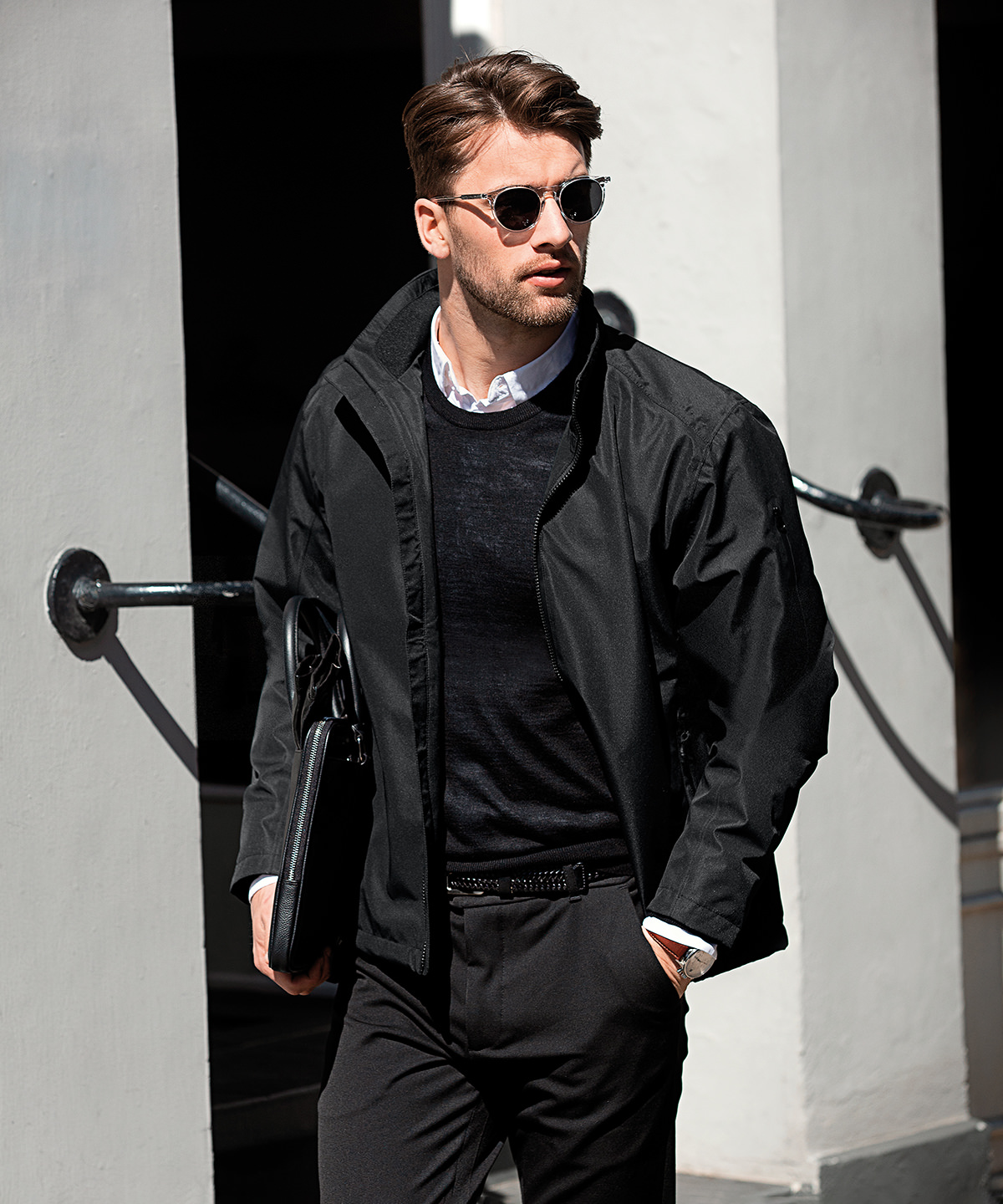 DETAILS: Windproof and waterproof with taped seams. Breathable fabric. Stand-up collar with knit detail inside. Water-repellent finish (Bionic Finish? ECO). Windproof. Water-resistance: 3000mm. Breathability: 3000gsm/24h. Critically taped seams. SUSTAINABILITY: Reach. Global Compact. Amfori. Water-repellent -?Bionic Finish? ECO