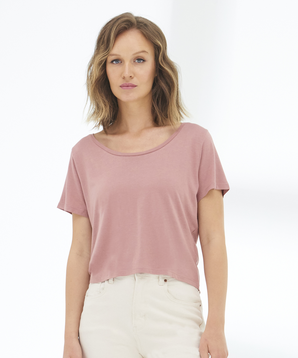 80% LENZING? ECOVERO? 20% organic Cotton. Sustainably managed wood sources. Single Jersey. Ribbed collar. Taped neck. Side seams ? non tubular body. Twin-needle detail at hem and sleeve. Set-in sleeves. Wide crew neck. Crop length with dropped back. Size label only for easy rebranding. Vegan certified.