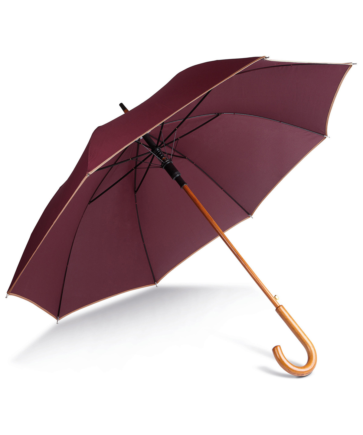 Classic wooden umbrella 23″ (58.5 cm) auto opening, pongee solid fabric, black metal frame, wooden shaft, wooden J handle, white metal tips, 96 cm ?. BSCI certified.