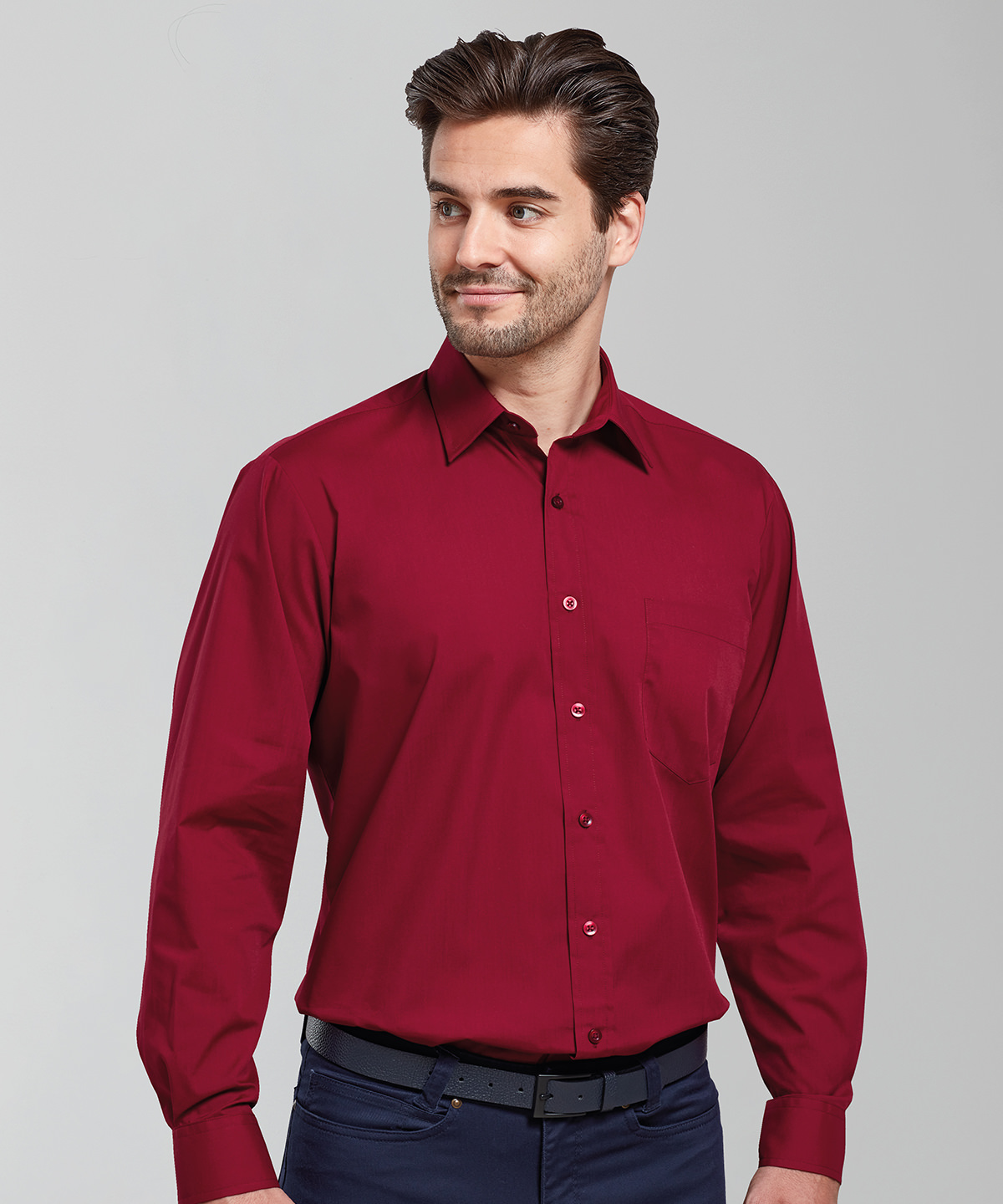 A men?s long sleeve Poplin shirt available in thirty colours. This classic work shirt has a stiffened formal cut collar and a left breast open mitred pocket. The long sleeve style has button fastened cuffs making for a smart and stylish shirt. WRAP certified. BSCI certified. Reach certified. SEDEX certified.