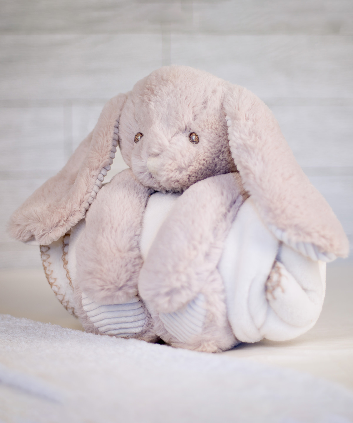 Light Brown soft plush rabbit. Contrast cream corduroy under ears and on paws. Hook and loop fastening on paws. Separate cream blanket in microfleece with contrast blanket stitching on edge. Delivered in a presentation bag with cream ribbon. Remove all hang tags and their fasteners before giving these items to a child. Suitable for children of all ages. Complies with EN71 European Toy Safety Regulations. BSCI certified. SEDEX certified.