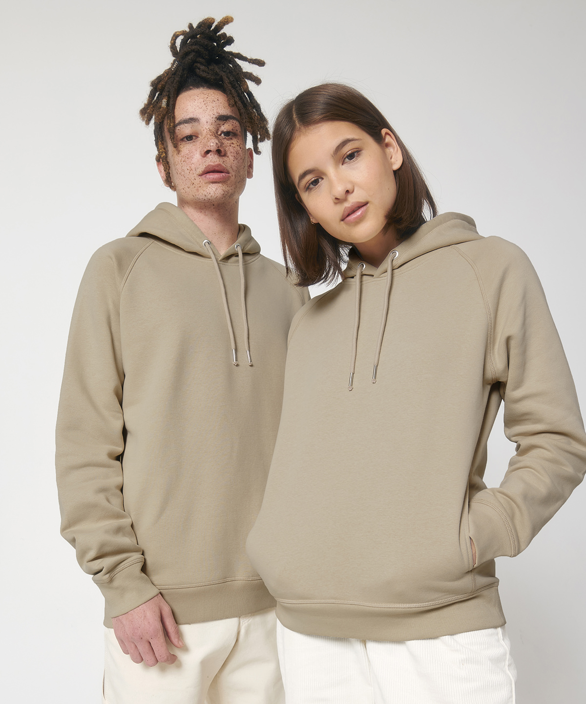 Raglan sleeve. Double-layered hood in self-fabric. Round drawcords in matching body colour with metal tipping. Metal eyelets. Inside herringbone back neck tape. Self-fabric half-moon at back neck. Slanted side seams with pockets. 1×1 rib at sleeve hem and bottom hem. Flatlock top-stitch on all seams. Vegan certified. Fairwear Foundation certified. Oeko-Tex certified.