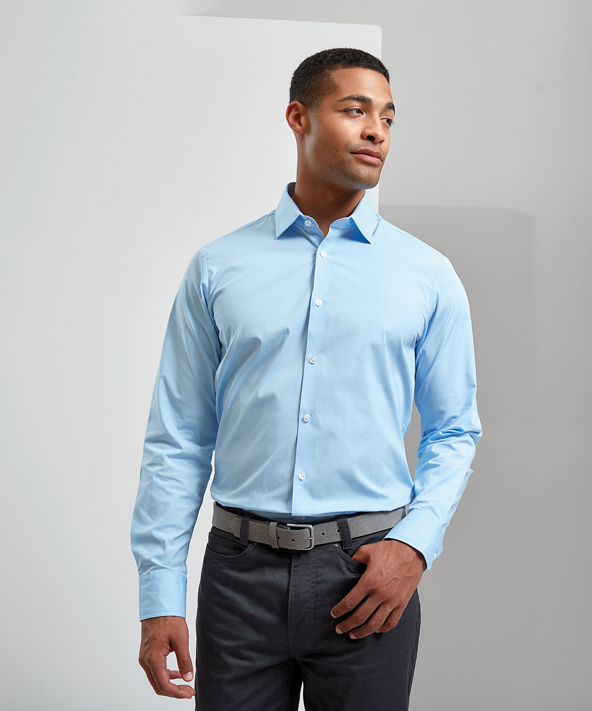 Cotton combined with elastane makes for a super soft, stretchy and comfortable fitted style for men. Double buttons on the cuff, together with a single button sleeve guard, allows for either a formal arm or a more casual roll back option. Styled with a stiffened cut-away collar with top button – which again, can be worn formally with a tie or open collared for a more relaxed look. WRAP certified. BSCI certified. Reach certified. SEDEX certified.