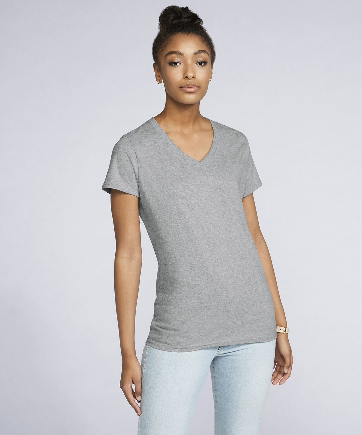 100% Combed ringspun cotton pre-shrunk. Semi-fitted contoured silhouette with side seams. 1.2cm mitred v-neck collar. Tearaway label. Taped neck and shoulder. Satin label. Twin needle sleeve and bottom hem.